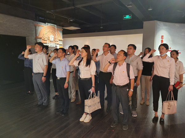 宣誓墙下,大家佩戴党徽,精神饱满,高举右拳,面向党旗宣誓,重温入党誓词,回首初心,不忘前行使命。