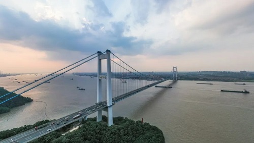 ▲ 江阴长江大桥,是连接靖江市和江阴市的过江通道,建成时是中国第一、世界第四大跨径的钢悬索桥。时至今日,它始终是客流最大的长江大桥。