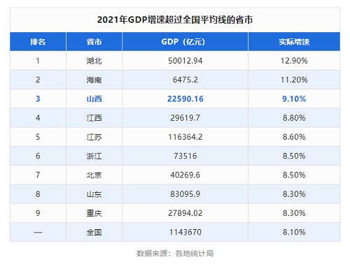 纵观2021年全国各省市GDP增速,无论以名义增速还是实际增速来衡量,山西都位居全国前三,彰显了资源型经济转型的强大后劲。