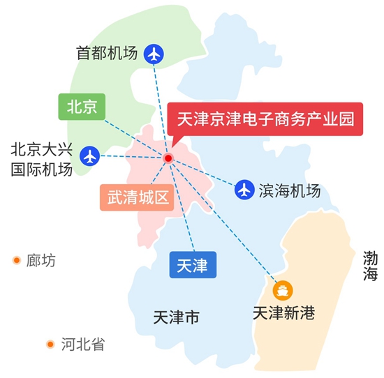 天津京津电子商务产业园坐落于天津市武清区东北部,是京津冀交汇区域之间重要的节点,距离北京市区71公里,距离首都机场90公里,具备海陆空铁立体交通网络,交通优势非常明显。