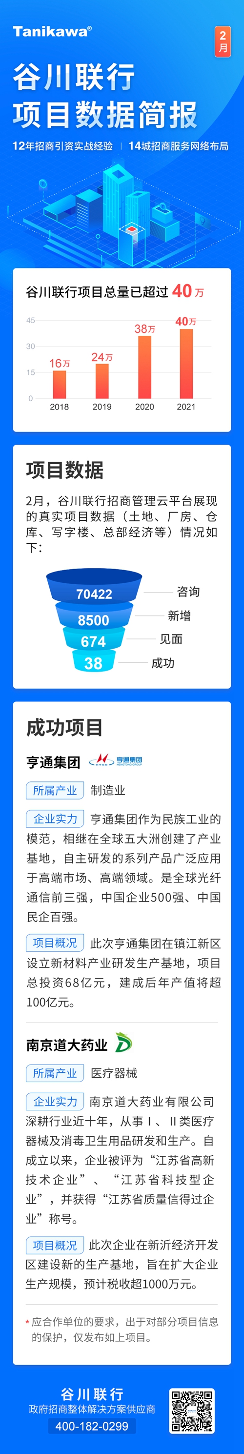 2月,谷川联行捷报频传,实现项目咨询量为70422个,新增项目8500个,见面项目674个,成功项目38个。截止2月底,谷川联行项目总量已超过40万,日均500+有效项目资源对接。