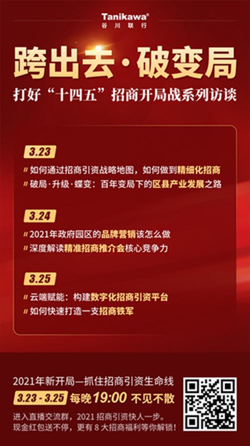 在此背景下,跨出去·破变局——打好“十四五”招商开局战系列访谈将于3月23日,在直播间震撼开启!「谷川联行」的招商大咖、业务专家、行业精英齐聚直播间,在互联网与招商引资的融合中寻找规律,助力地方政府下好区域发展先手棋,打好招商引资主动仗。
