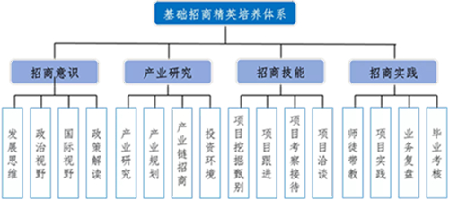 谷川培训学校针对基础招商精英进行2-3个月集中式精准培养,从招商意识、产业研究、招商技能、业务实践等方面打造理论与实践相结合的应用型、专业化招商人才,培养模型如下: