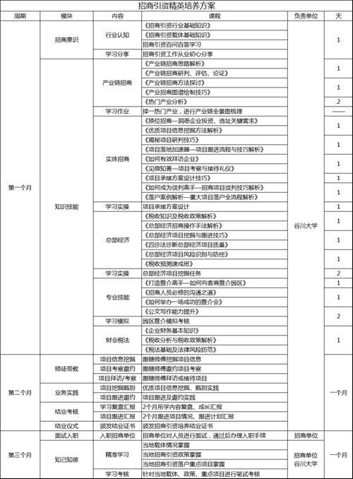 以独立开展招商引资工作为培养目标,谷川培训学校对基础招商引资精英进行针对性培养、业务实践、综合考核,输送到各招商单位进行面试,面试通过后可到岗工作,与招商单位或旗下平台公司签订劳动合同。