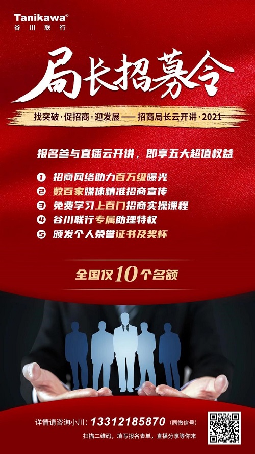 现谷川联行继续向全国招商局长发出招募令!整个分享活动中,局长足不出户就可以直播传授经验,而物料制作、全媒体宣传、用户互动、听众报名、直播间设置等都由谷川联行专业人士进行操作,把准备工作做到极致。