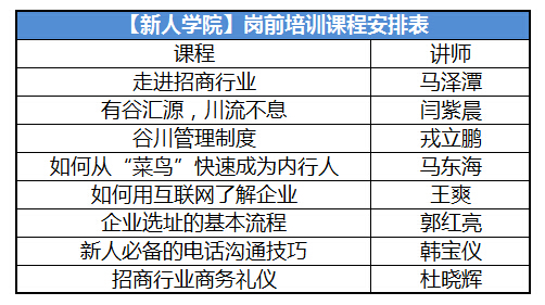 为了提高学员的职业技能和综合素质,此次培训特别邀请了一支“身经百战”的讲师团队。他们是谷川联行最优秀的业务精英,同时也是常年奋战在招商一线的资深工作者。健全的课程体系,为学员搭建了全方位了解公司、了解行业、夯实基础、学习知识的宝贵平台。