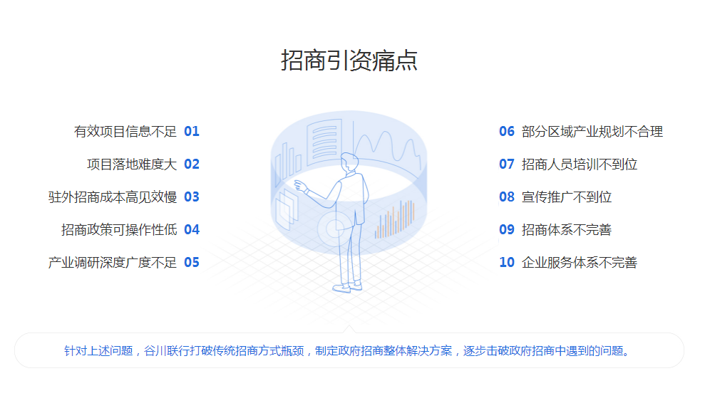 九年来,谷川联行专注于招商引资领域,服务过近百家政府园区、超过10万个项目。在深入对接的过程中,我们发现,很多政府单位在招商过程中,往往投入大量人力物力财力,结果却收效甚微。
