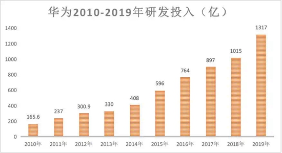 2019年,华为研发费用高达1317亿元,占全年销售收入15.3%,近十年研发投入总计超6000多亿元。此外,据欧盟委员会公布的数据显示,华为的研发投入排名全球第五,跟微软一个级别,领先苹果、英特尔等公司。