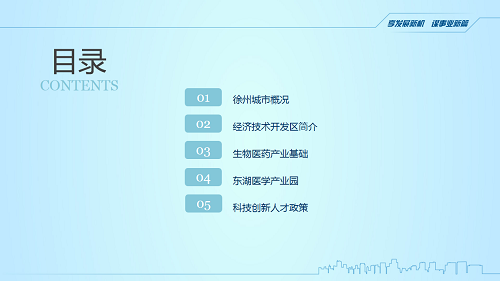 我以徐州经济技术开发区生物医药产业招商介绍来举例,通过这个PPT来展示我的一个工作思路,汇报分了五个章节,包括城市概况、地方简介、产业基础、重点园区还有科技创新人才政策。