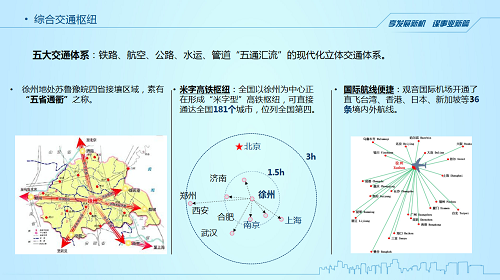 第二个环节,我强调了区位优势,因为过去我们的产业是农业经济的时候,是地在哪里,人就住到哪里,所以说村庄比较多。现在是什么?现在是工商业社会。工商业社会是什么?是交通枢纽在哪里,产业就会集聚在哪里,因为工商业社会是建立在交换基础上产生的,所以交通对大家很重要,所以我就突出了我们徐州交通的地理区位。