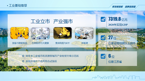 下一个,我来向客商介绍徐州是一个工业基础雄厚的城市,我们的发展概念是工业立市、产业强市,2020年的GDP是7319.8亿。很多投资商都会先去问一下你当地城市的GDP,因为它代表了一个城市的综合实力。