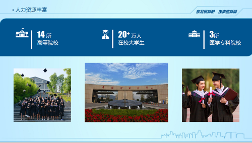 在这里面为什么要单独讲3所医学专科院校,因为我这个PPT是做生物医药产业的,所以在这个环节上我就告诉企业,在这里你能够得到足够的人力资源支撑,医疗实力强劲,发展生物医药产业其实不是在于生产能力,而是在于市场的消化能力,也就是说看的是医疗端,不是看的生产端。