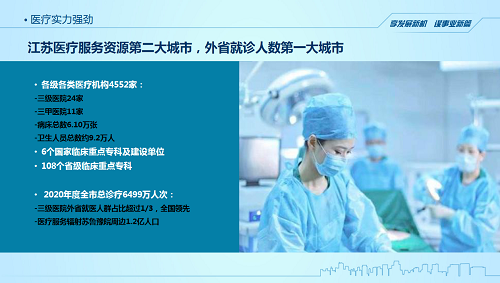 在这里我给客商展示徐州是江苏省医疗服务资源的第二大城市,因为第一大是省会,但是从外省就诊人数来看,徐州是第一大城市,就说明了城市医疗资源的影响力。同时我也向客商集中展现了徐州有多少家三甲医院,多少家病床,多少个卫生人员,多少人次的门诊量,这个对于制药厂、医疗器械厂,他会看到有一个很大的区域市场,自然而然的就会在内心里面更加的认可你。