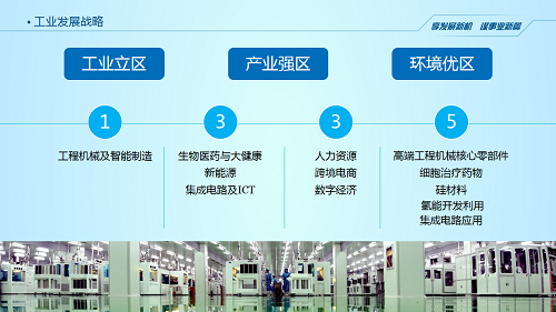 最后一个就是说科技创新,科技创新一定是围绕着我们主导产业进行科技创新,不是说把它变成一个空泛的概念,我这里锁定了五大科技创新的目标,就是高端工程机械与核心零部件、细胞治疗药物、硅材料、氢能利用和开发和集成电路的应用,这个是跟我园区的主导产业是相契合的。