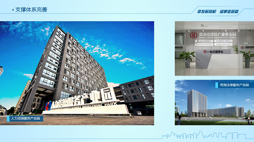 下面我展示了我们的支撑体系,人力资源产业园、法律服务产业园、基金产业园,这些产业园是一个服务体系。那么企业在发展的时候,它不是一个真空的空间,它一定是跟外部建立大量连接的,它是需要能够快速的找到这些支撑体系的。那么我们有了一个支撑体系以后,他会觉得很便利,在这里跟一些一线城市也没有什么区别,那么他们就会安心在这里发展。
