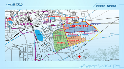 这是一个当地园区的细分规划,围绕东湖医学产业园,我们把徐州的两所医学类的高校都搬到了产业园边上,一个是徐州医科大学,我们建了一个2200亩的新校区,同时我们有一个江苏省医药高等职业专科学校,也给它500亩地建一个新校区。