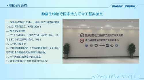 在这里面我又向客户特别介绍,我们发展细胞治疗药物,有一个肿瘤生物治疗国家地方联合实验室,在这个联合实验室里面我特别把它罗列出来,有SPF级的实验房,可以满足22个课题组,有2个P2实验室,有28个GMP车间,包括正压的8间和10间,两个负压的车间5间和5间,包括抗体平台库,包括细胞室、仪器室,还有共享平台实验室,还有重创孵化空间。