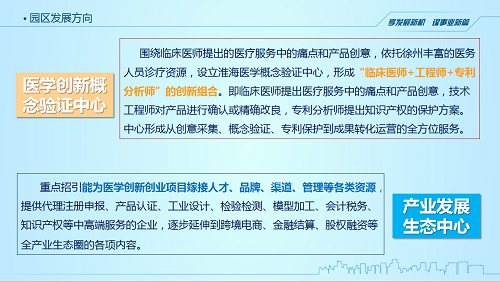 我这里特别要给大家介绍医学创新概念验证中心这个概念,因为我们徐州有很多的三甲医院,有丰富的临床资源,我们的外省就诊量是全省第一。这些临床资源在从事医疗服务的时候,他有很多的痛点,他也有很多的想法,他想改进他的想法,我们称之为产品创意。