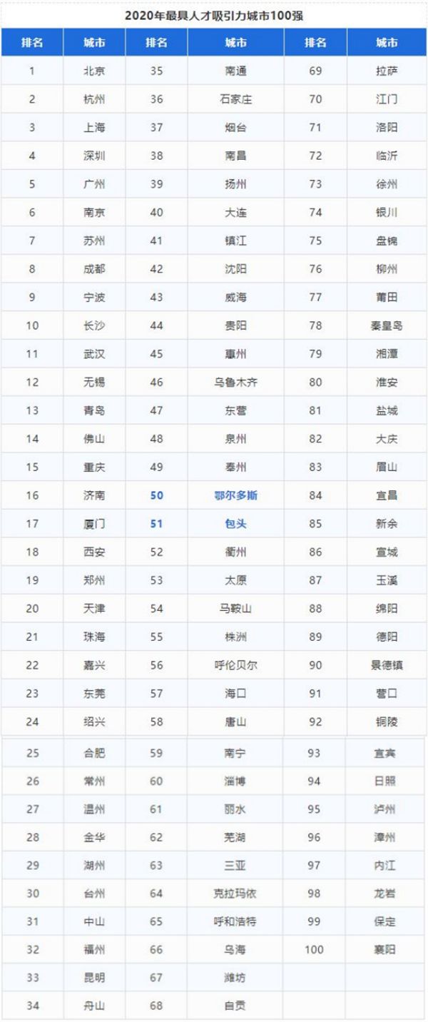 在智联招聘发布的《2020年最具人才吸引力城市100强》中,鄂尔多斯和包头分别位列第50、51名。榆林并未上榜,铩羽而归。