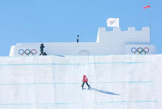 谷爱凌今天(2月15日)的比赛场地位于张家口市崇礼区的云顶滑雪公园,赛道起点的“雪长城”在阳光下晶莹剔透,显得格外壮观。