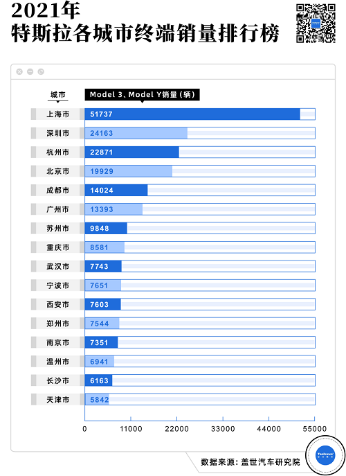 如图所示,特斯拉2021年在上海的销量,比深圳、广州这两座城市加起来还要多。