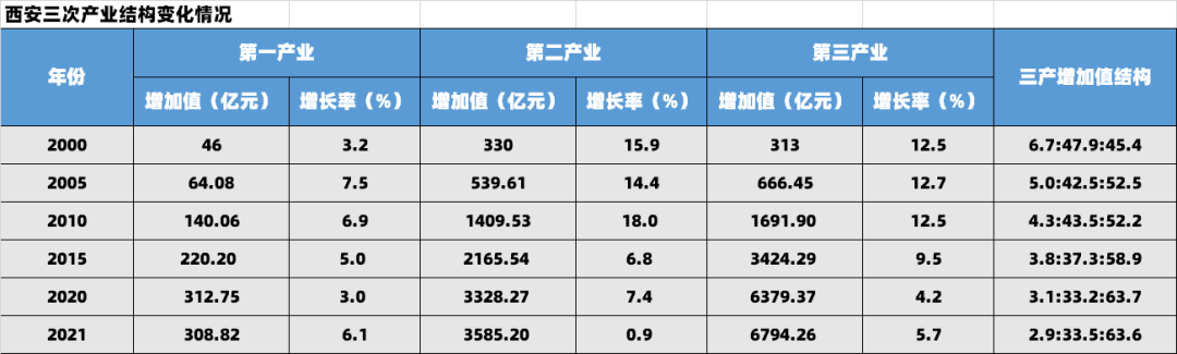 步入21世纪之后,尤其是近几年,西安大力发展第三产业,虽然在整体GDP增速和服务业蓬勃发展上交出了亮眼的答卷,但缓慢爬升、动力不足的工业始终制约着西安经济的发展,在总量、增速、投资、吸附能力上的短板逐渐显露出来。