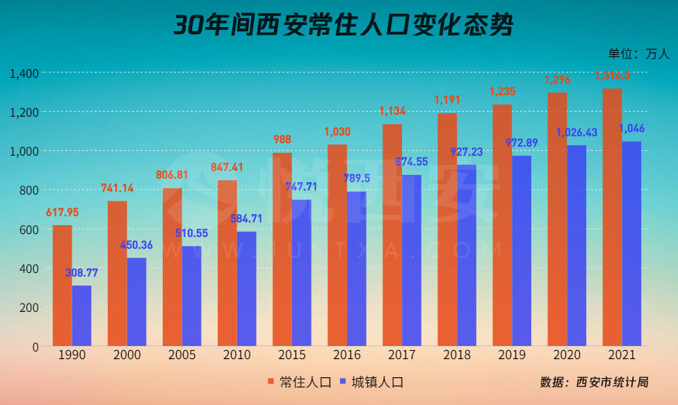 公开信息显示,截止2021年末,西安全市常住人口为1316.30万人。 而距离2020年11月第七次人口普查的1295.29万人相比,一年之间,西安实现了超过20万的人口增长。