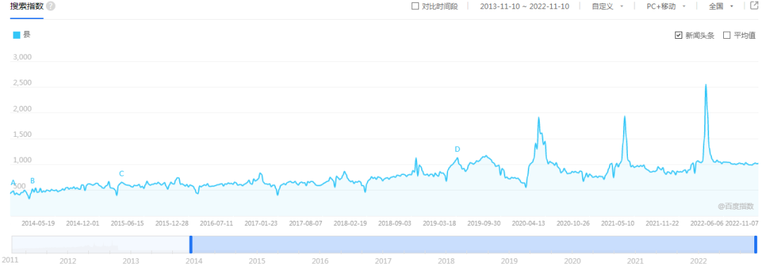 在百度指数中搜索“县”,会发现这条曲线正在不断走高,并且在2020-2022年出现了3个明显的峰值。