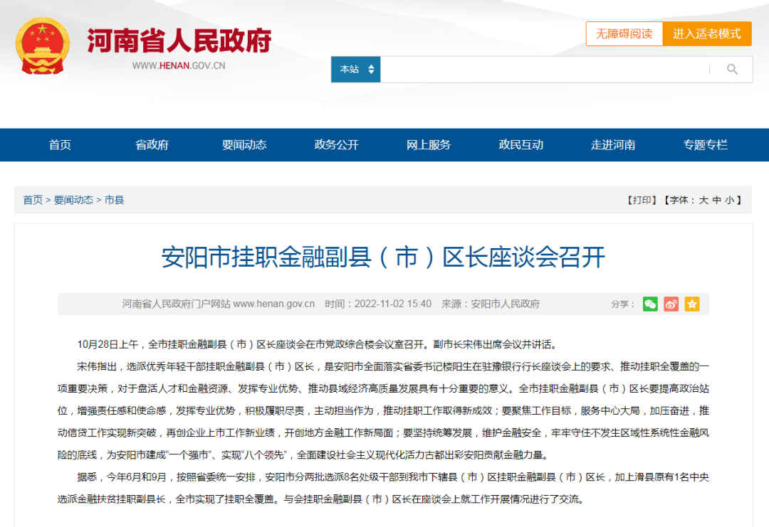 今年以来,河南多座城市先后实现挂职“金融副县(市)区长”全覆盖。