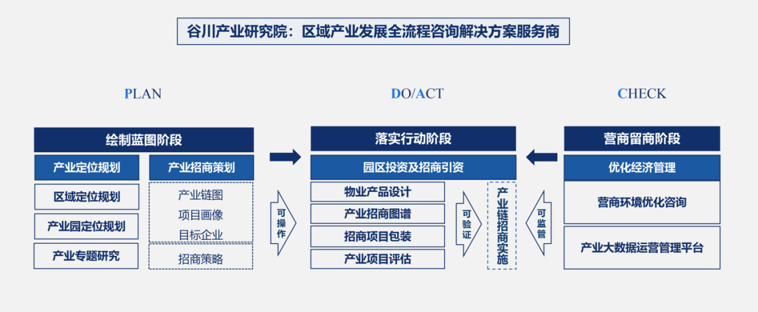 谷川产业研究院,可协助园区开发方从0-1建设特色产业园,从产业用地性质规划建议,园区配套及动线,载体户型及规格参数、招商实操手册等进行系统化设计,提高产品匹配性和去化率, 避免厂房空置或后期改建等问题。