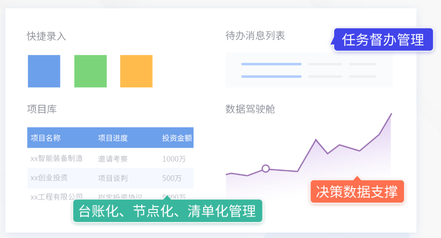 从项目的初次接触开始,就像一个敏锐的信息收集者,能覆盖在谈、签约、推进、落地、履约等项目全生命周期环节,通过任务督办、绩效考核、数据可视化统计等功能,为招商团队做后端支持,解决信息处理问题。