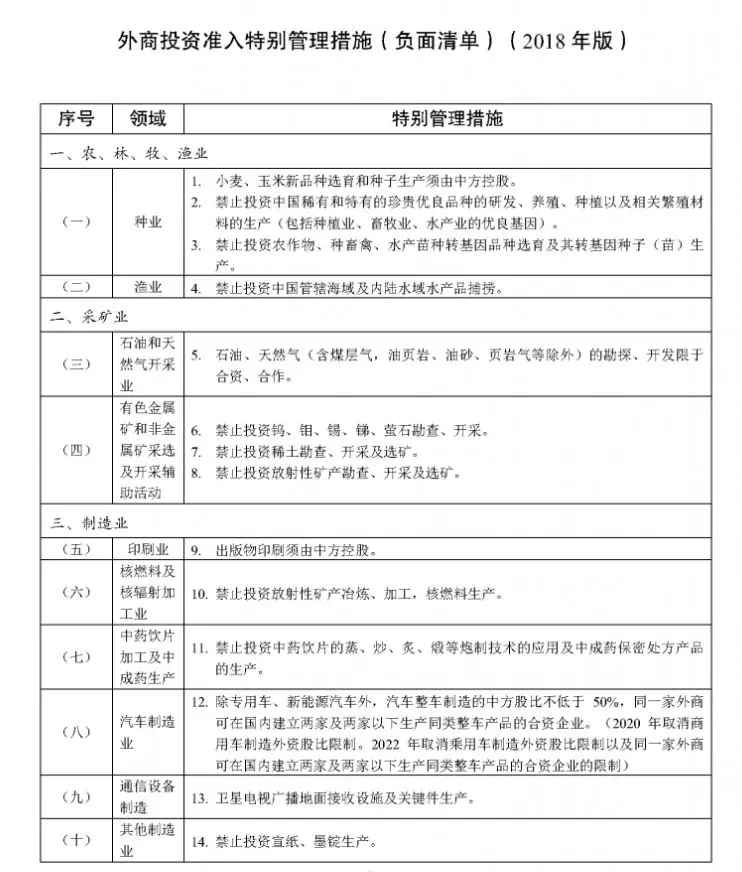 《外商投资准入特别管理措施(负面清单)(2018年版)》已经党中央、国务院同意,现予以发布,自2018年7月28日起施行。