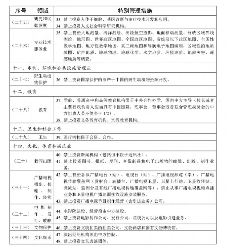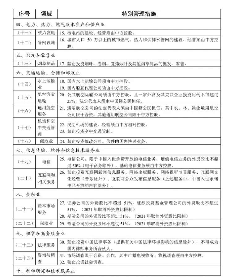 一、《外商投资准入特别管理措施(负面清单)》(以下简称《外商投资准入负面清单》) 统一列出股权要求、高管要求等外商投资准入方面的特别管理措施。《外商投资准入负面清单》之外的领域,按照内外资一致原则实施管理。
