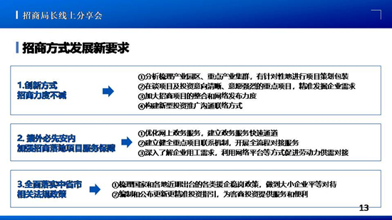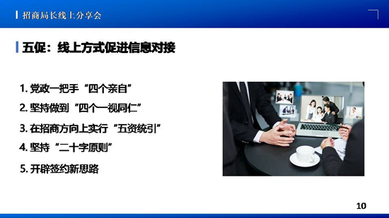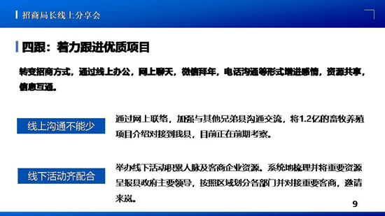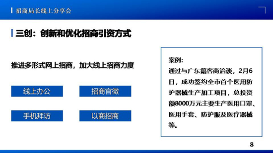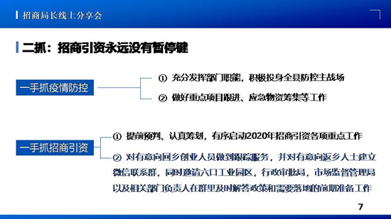一方面转变招商方式,通过线上办公、网上聊天、微信拜年、电话沟通等形式增进感情、资源共享、信息互通。