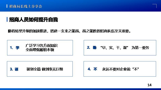 三是就要“谋”,谋也就是思考。作为一个企业老总,通常我们会尊称为“总”,殊不知,这个“总”字:上面两点要想,中间是口要说,下面是心要想。而我们作为一个招商人,这个“招”字,旁边用手拉(引),上面悬着一把刀(纪律),嘴里讲的是政策(规矩),来不得半点马虎,所以在项目来临的时候要懂得谋划全篇,必须做到事无巨细。政策要吃透,眼光要长远,想对方所想,急对方所急。
