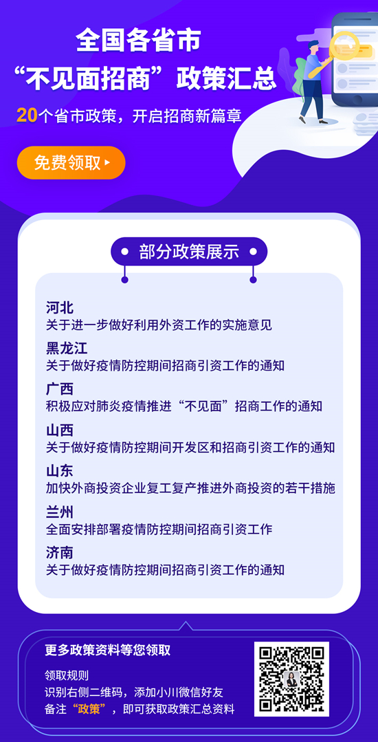 小川特整理了20个省市的“不见面招商”政策,超过3万字,现免费提供给各位招商人,希望能对大家开展招商工作有所帮助。