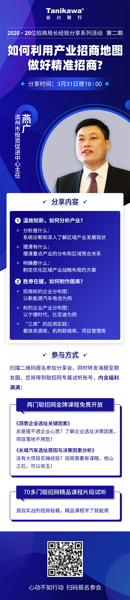 3月31日晚19:00,我们将以直播的形式,举办第二期招商局长分享会。此次谷川联行邀请了山东省滨州市投资促进中心主任燕广,与大家分享“如何利用产业招商地图做好精准招商?”。燕主任多年来孜孜不倦地探索招商引资创新方式,他有着丰富的招商案例分享经验,注重实践与效率,获得好评无数。此次,他将通过真实的案例、翔实的数据,为各地产业招商地图的绘制和实践提供新思路。
