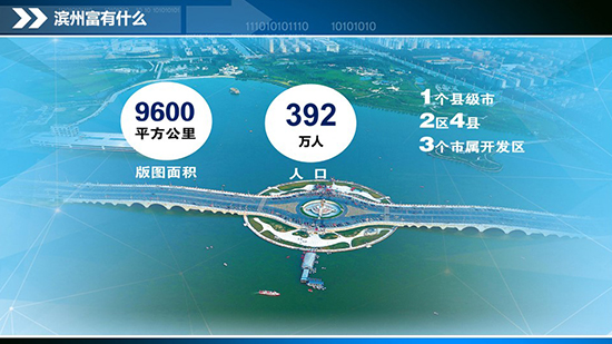 滨州位于山东省的北部,是山东省的北大门和西大门。滨州版图面积是9600平方公里,人口是392万,辖两区一市四县和三个市属开发区,区位优势非常独特。以滨州为中心100公里,辐射7个城市;以滨州为中心300公里,辐射7个二线城市。