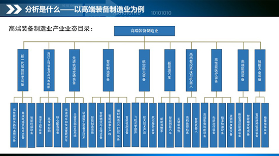 比如说高端装备制造业,它是我们国家的制造母机,也是制造重器。但是高端装备制造业的招商如何来开展,需要对它的行业业态、产业类型进行细化。比如说高端装备制造业,它包含着航空装备制造、航天装备制造、轨道交通装备制造等。并不是所有的高端装备制造业,我们都能够发展起来。所以要梳理我们有什么,然后再去明确我们要什么。通过梳理我们本地的产业发展资源,梳理出高端制造业的现状。