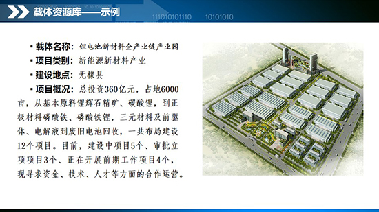 因为每个产业对载体资源的需求是不一样的。如果我们推送的载体资源匹配度不够,对于项目的洽谈成功率是有影响的。我们针对新能源电池产业,专门规划了锂电池产业园,总投资是360亿元,占地是6000亩。目前,园区内已经布局了刚才提到的正极、负极、隔膜、电解液的全产业链。