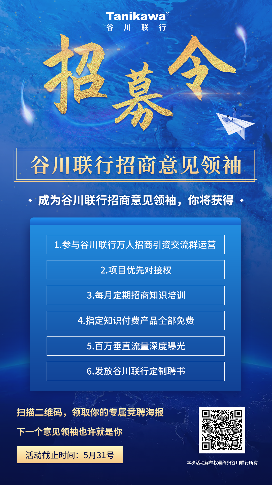 关注【谷川联行助手】公众号,生成招商意见领袖竞聘海报。将海报发送至朋友圈或者社群中,邀请好友进行助力,最后得分最高且符合要求的前5位朋友即可成为谷川联行招商意见领袖!