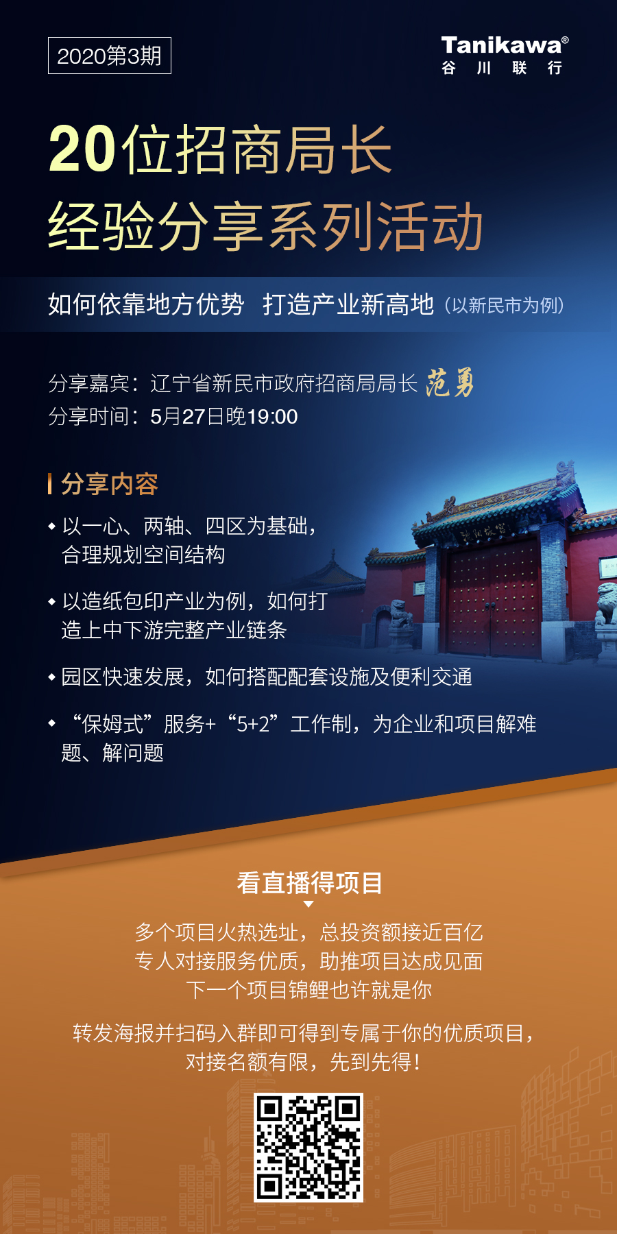 5月27号晚19:00,我们将继续以直播的形式,举办第三期招商局长分享会。此次谷川联行邀请到了辽宁省新民市政府招商局局长范勇,与大家分享“如何依靠地方优势 打造产业新高地”。