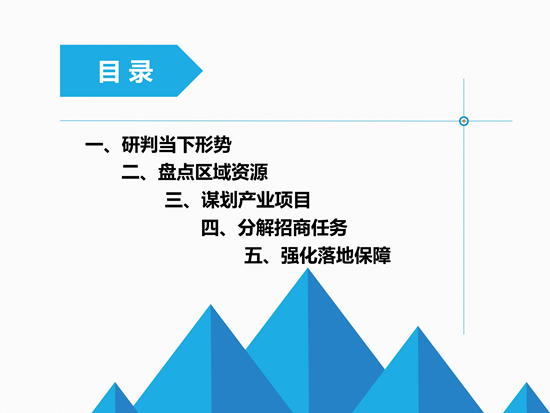 我今天分享的材料主要分为五大部分,其中包括研判当下形势,盘点区域资源,谋划产业项目,分解招商任务,强化落地保障。