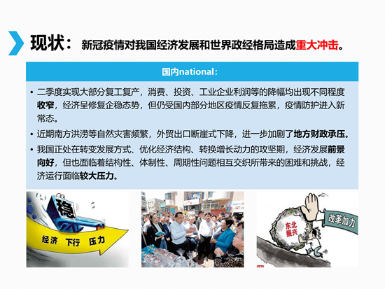 第一部分,研判当下形势,审时度势,戒骄戒躁,伺机而动,后发而致胜。我们大家都很明确当下的一个经济形势,新冠疫情对我国经济发展和世界竞争格局造成了重大冲击。