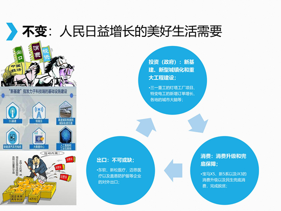 在消费领域我们有两点认知,一点叫消费提质,一点叫保障民生。沈阳有一个重要行业就是汽车行业,龙头企业是宝马,宝马今年的市场销量还是非常不错的,宝马的X5、新5系以及iX3的消费升级,带动了一个地方产业的继续发展。然后民生兜底消费,这是为了保障我们整体经济的大盘子,这是我对于未来主观世界和国内形势的一个基本判断,和对我们未来国内经济形势和新常态下,我国相关政府机构和市场发展机构所能形成的一些机会和政策要点。
