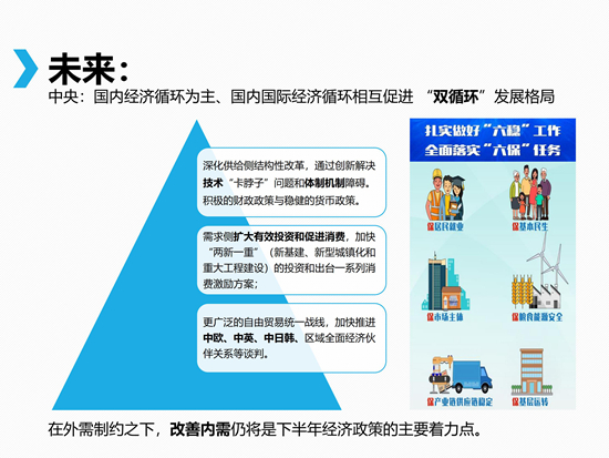 继续解决需求侧,扩大有效投资和促进消费,加快“两新一重”,新基建,新型城镇化和重大工程建设的投资,和出台一系列消费政策,包括各地消费券的发放。新基建现在一些任务相关的安排已经落实下来,更广泛的自由贸易统一战线,加快推进中欧、中英、中日韩,区域全面经济伙伴关系等谈判。当下国务院已经批复了中韩在长春建立了中韩合作区域,在大连建立中日合作示范区。中日韩未来发展我们很期待的。从以上所有的过程,所有的说明来讲,我们可以看到未来明确的一个经济形势就是在外需制约之下改善内需,仍将是下半年经济政策主要着力点。