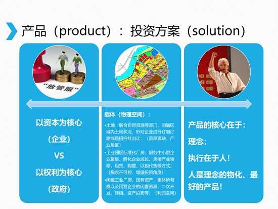 第三部分,今年很多区域,包括我们辽宁省就下发了一个盘活利用闲置厂房方案的三年行动计划。盘活利用闲置的工业厂房,其中包括国有资产、集体所有权和民营企业的闲置资源,二次开发、转租、资产拍卖等。其实说白了这一部分,我们要给企业看到利润空间,要捡便宜。然后我们产品的一切核心在于什么?在于我们的理念,这就回到我们第一个拷问,我们到底是服务于资本,还是服务于权利?执行在于人,一切的理念执行就是在于人,人是最好的产品,人是理念的物化。