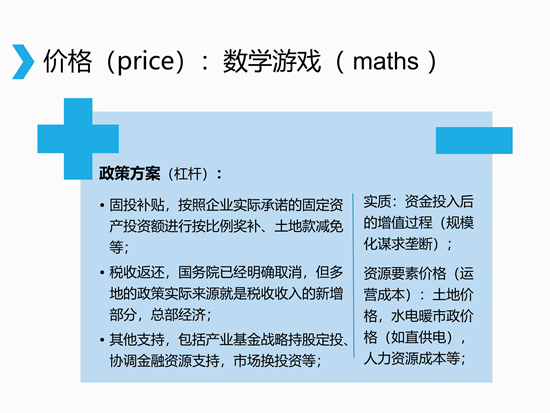 价格:数字游戏。我们价格的表象是指我们的资源要素价格,包括我们土地相关的运营要素成本。人力资源成本最终直接构成了一个企业在我们区域内的一个运营成本,这也是企业投资过程中一个主要的考量的一个基点。其实企业投资实质就是资金投入后的一个增值过程,他通过一些规模化,通过其他一个方式谋求垄断的一些利润。我们对价格的一个撬动,就是通过我们政府的政策,相关一些有形的手来搅动无形的市场。