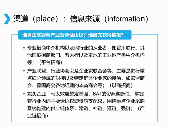 包括沈阳我个人接触多一些,比如说欧盟商会、德国商会以及各地组建的本省商会等,这个是我们叫做以商招商,上一步是平台招商,那下一步就是产业链招商,产业链招商更注重的是以龙头企业为依托,因为我们当下市场马太效应愈发增强,BAT相关的方面一些资源的垄断性,资本资源等其他的一些资源,掌握着行业内的主要话语权和资源的支配权。我们的产业链招商就是完全围绕于重点企业的采购系统构建的供应链体系,建链、补链、严链、强链,其他的包括一些资本招商,也是通过一些资源的支配进行招商活动,这些就是我们总结的一些相关渠道信息来源。