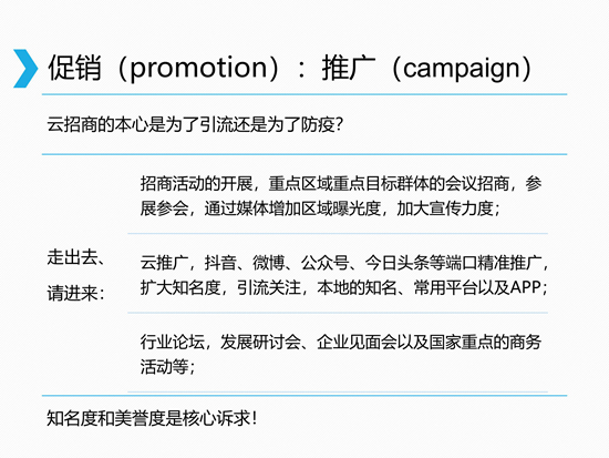促销:推广。那么促销的核心实际是推广,推广什么?推广我们的服务,推广我们的诚信。要想富,多修路。推广过程中,当下比较火的叫云招商,云招商的本心是为了引流还是为了防疫?在推广过程中,我们会提出一些相关的走出去请进来的活动。走出去,招商活动的开展,重点领域、区域,重点目标群体的会议招商、参会展会,通过媒体增加区域曝光度,加大宣传力度,这是展会的一个招商。云推广、抖音、微博、公众号、今日头条等端口的精准推广,扩大知名度,引流关注,本地的知名和常用平台以及APP。
